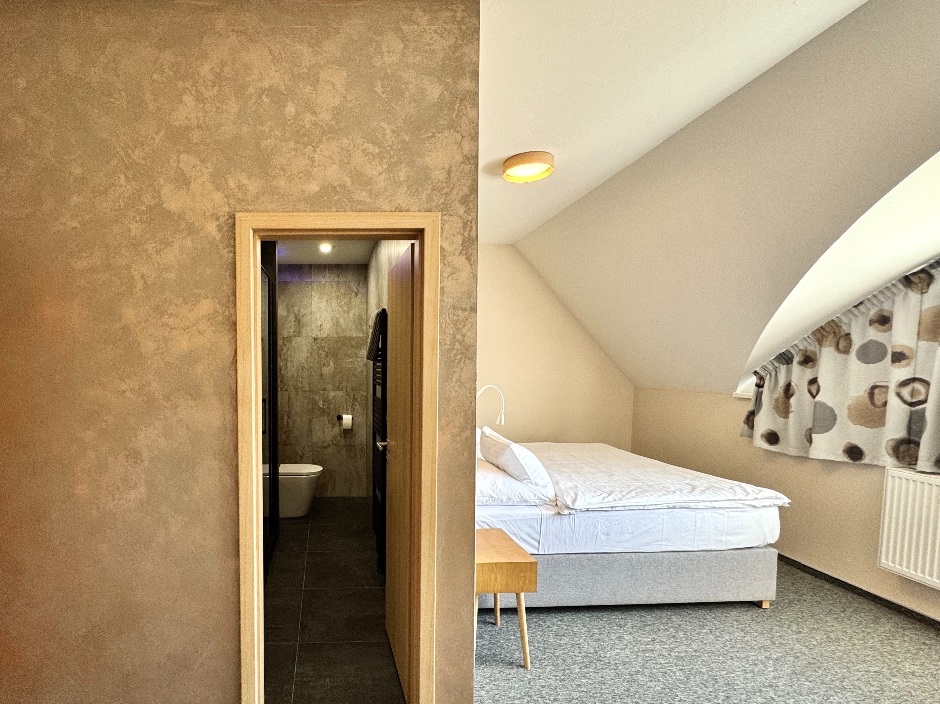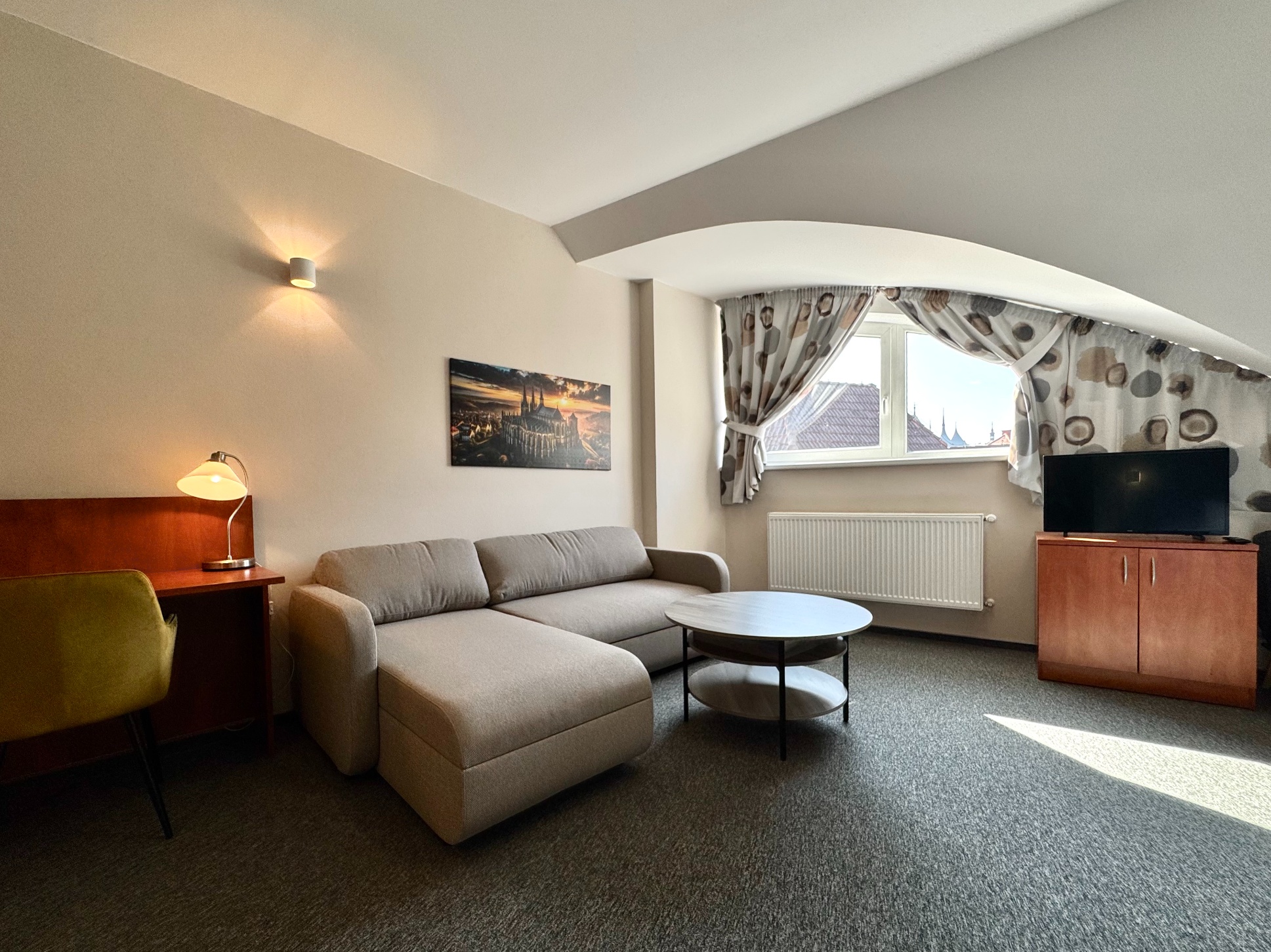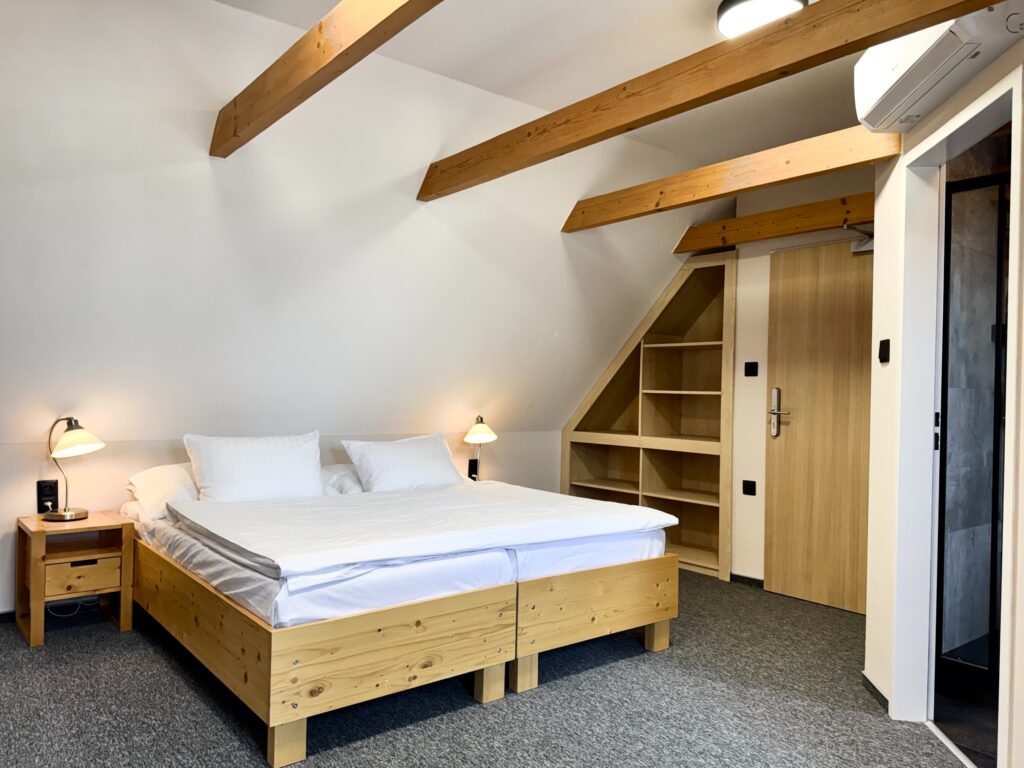 Útulný dvoulůžkový pokoj s variabilními postelemi, smart TV, ledničkou a kávovarem.